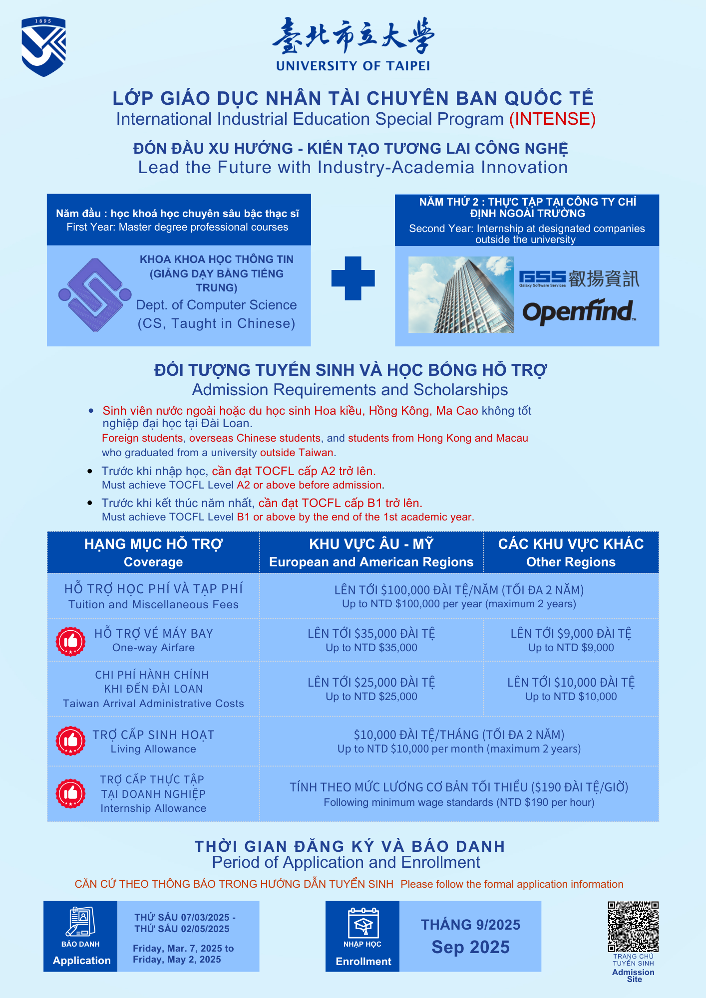 Lưu ý: Người nhận học bổng INTENSE sẽ không được đồng thời nhận học bổng khác của trường/Chính phủ Đài Loan. Chi tiết cập nhật theo OIA.