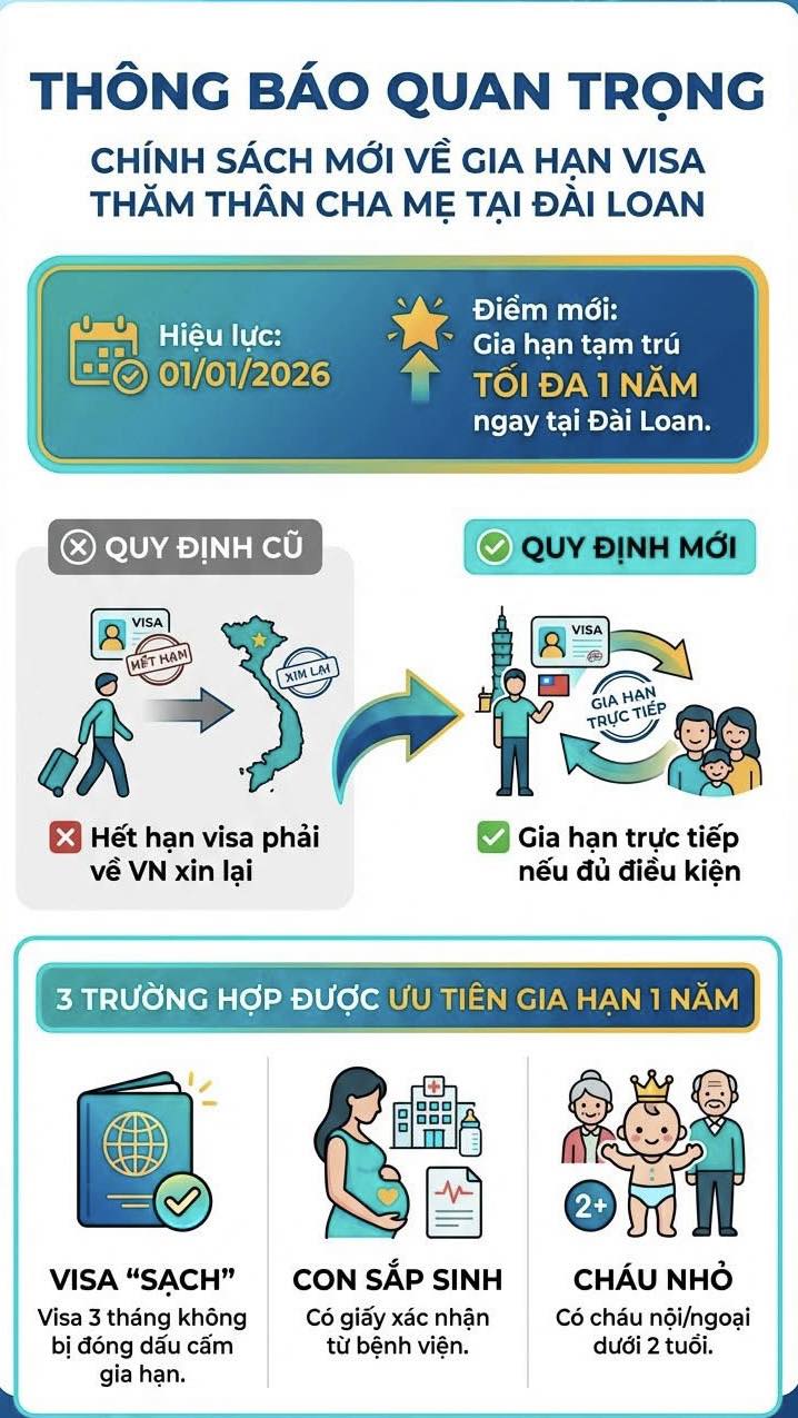 Visa thăm thân cha mẹ nay có thể gia hạn trực tiếp tại Đài Loan, tối đa lên đến 1 năm, KHÔNG cần về Việt Nam xin lại visa như trước đây (nếu đủ điều kiện).