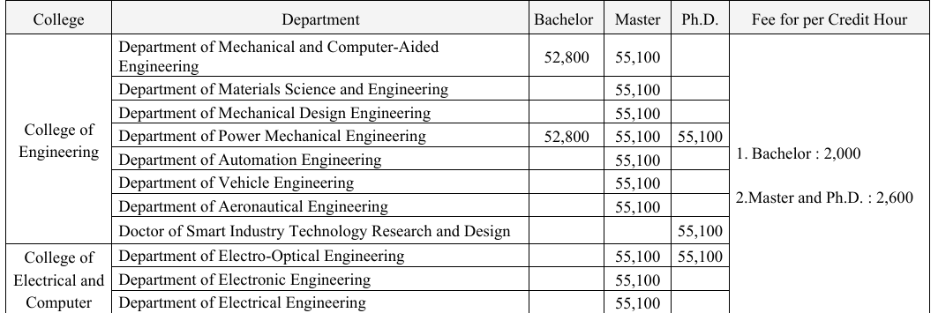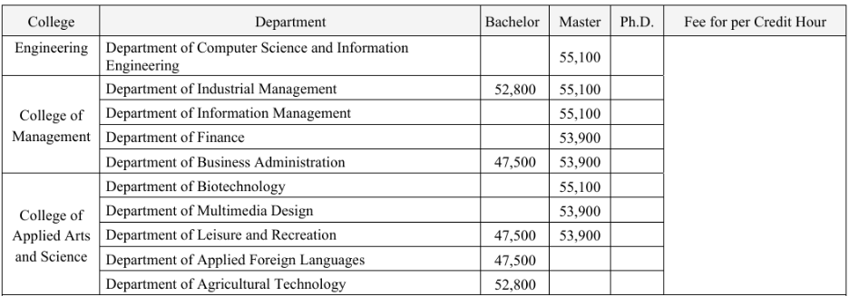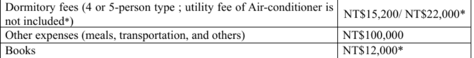 Chi phí sinh hoạt ước tính khoảng NT$127,200 mỗi năm, bao gồm nhà ở, ăn uống, đi lại và sách vở.