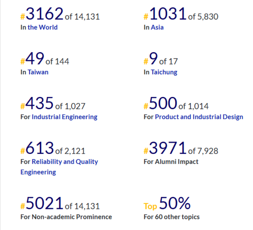 Trong từng mảng học thuật cụ thể, NCUT đạt nhiều thành tích ấn tượng: ngành Khoa học Máy tính xếp thứ 37 tại Đài Loan và thứ 1.883 toàn cầu; Khoa học Môi trường giữ vị trí thứ 43 trong nước; Quản trị Kinh doanh nằm trong top 30 Đài Loan, ở vị trí thứ 1.533 thế giới; ngoài ra, các ngành Toán học, Hóa học, Sinh học và Khoa học Xã hội – Nhân văn đều được xếp hạng cao, thể hiện sự phát triển đồng đều giữa các lĩnh vực kỹ thuật, công nghệ và quản lý.