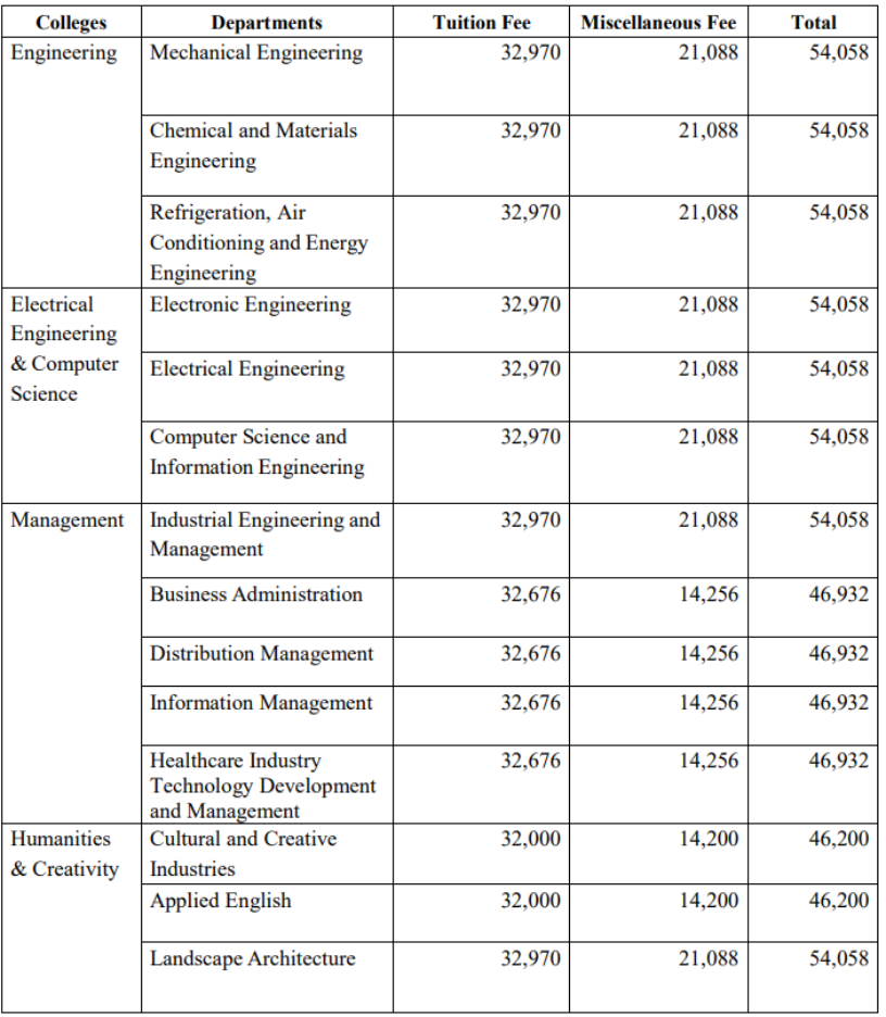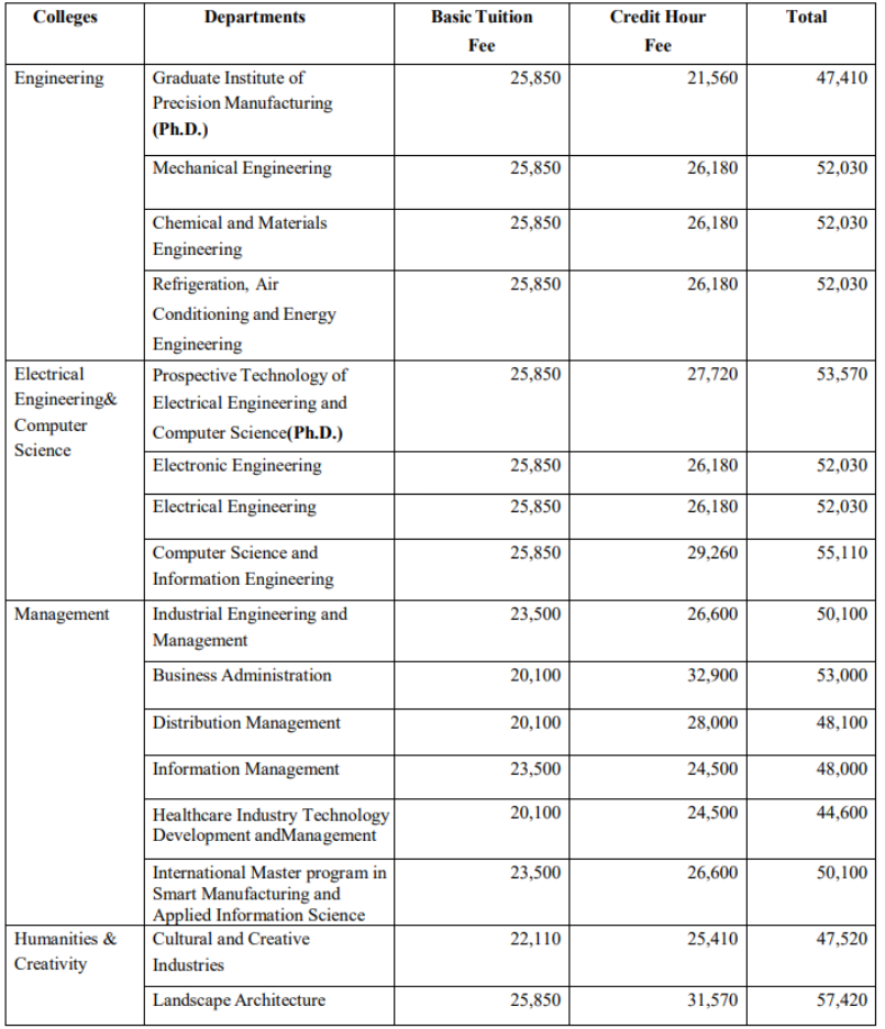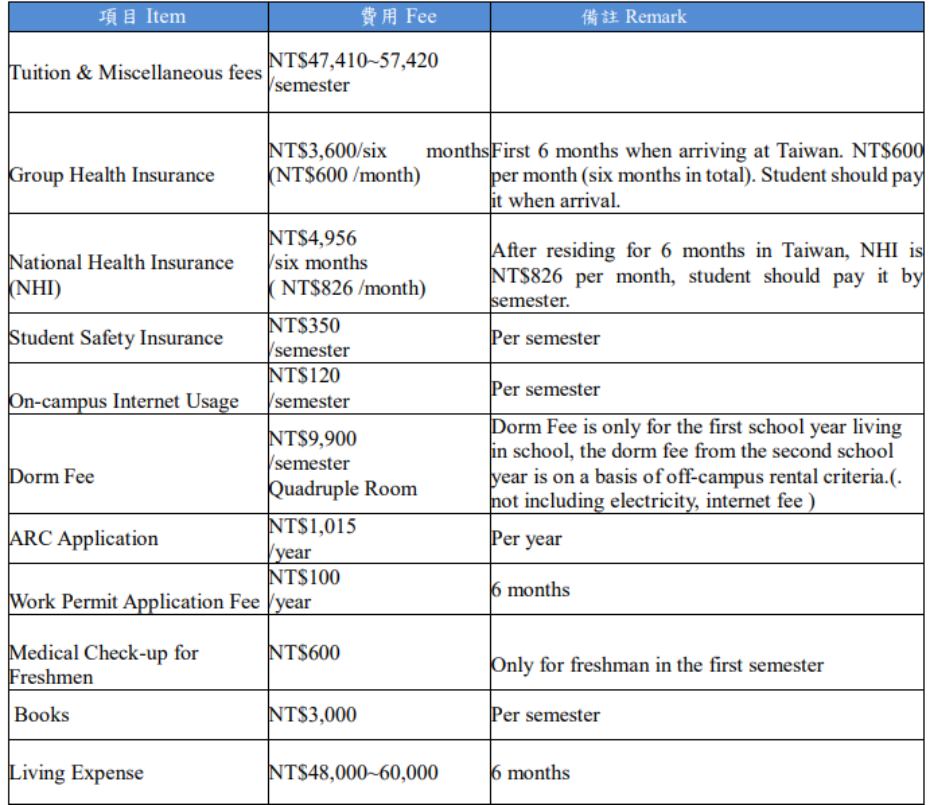 - Đối với chương trình INTENSE của thạc sĩ, từ năm 2024: học phí và lệ phí năm đầu được trợ cấp bởi Hội đồng Phát triển Quốc gia (NDC) (NT$100,000/năm), phần thiếu hụt được trường bù đắp.