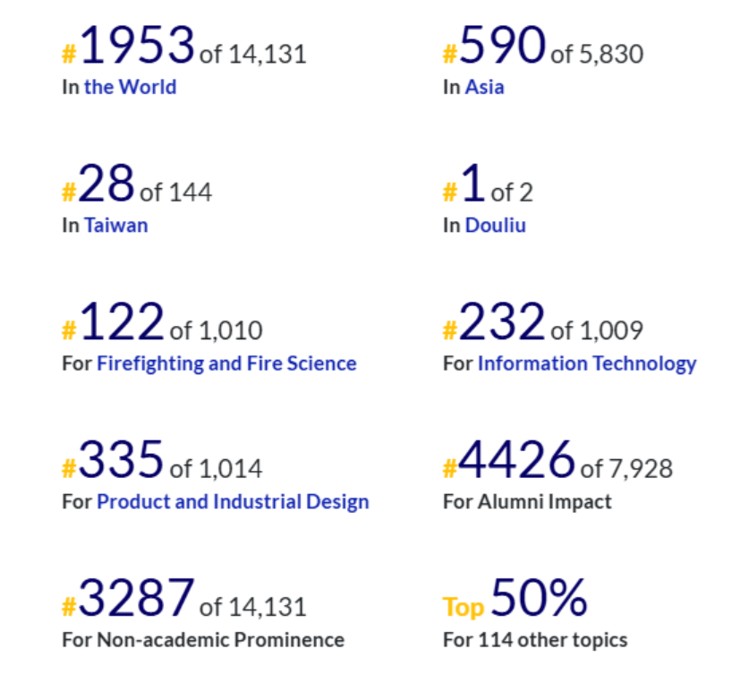 Ngoài ra, theo Times Higher Education (THE) World University Rankings 2026, YunTech nằm trong nhóm 501–600 trường đại học hàng đầu thế giới; đồng thời được CWUR xếp hạng 1.820 toàn cầu và SCImago Institutions Rankings đánh giá có hiệu quả nghiên cứu và đổi mới trên mức trung bình thế giới.