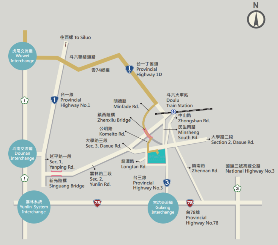 Quốc lộ 1 (National Highway No. 1): có các lối ra để vào Đấu Lục, tiếp tục đi đường địa phương để đến Đại học (Đại học Lộ 3, YunTech)