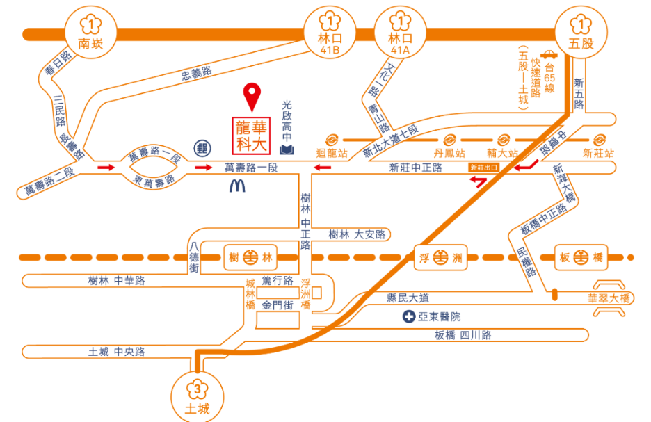 Đi tuyến Đường sắt Đài Loan (Taiwan Railway) và xuống tại Ga Shulin, sau đó chuyển sang xe buýt Huilong, khoảng 45 phút sẽ đến trường.