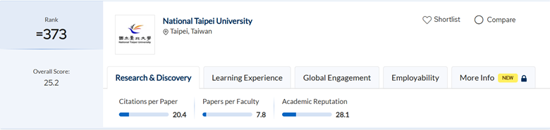 Trong bảng QS Asia University Rankings, NTPU giữ vị trí top 373 châu Á.