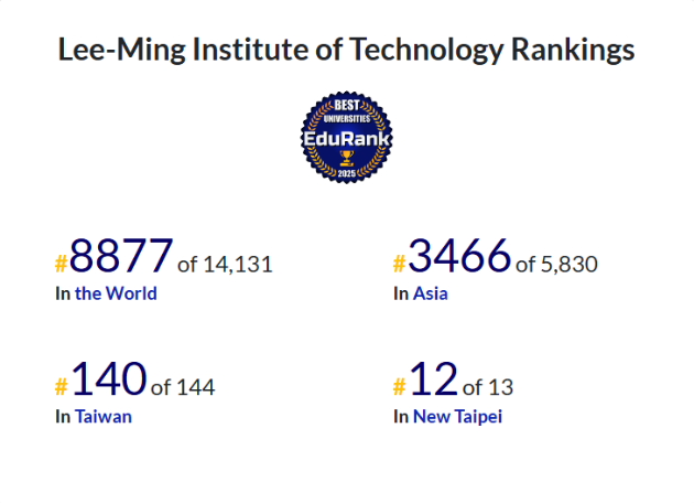 Theo bảng xếp hạng của EduRank năm 2025, học viện Kỹ thuật Lê Minh (Lee-Ming Institute of Technology – LIT) hiện được xếp hạng #8.877 trên thế giới, #3.466 tại châu Á, #140 tại Đài Loan và #12 trong số 13 cơ sở đào tạo tại thành phố Tân Bắc. Kết quả này dựa trên phân tích từ dữ liệu học thuật, trích dẫn nghiên cứu, uy tín phi học thuật và mức độ nổi tiếng của cựu sinh viên. Mặc dù thứ hạng còn khiêm tốn so với nhiều trường khác tại Đài Loan, LIT vẫn duy trì định hướng đào tạo thực tiễn, chú trọng kỹ năng nghề nghiệp và hợp tác doanh nghiệp, tạo nền tảng vững chắc cho sinh viên trong quá trình học tập và phát triển nghề nghiệp.