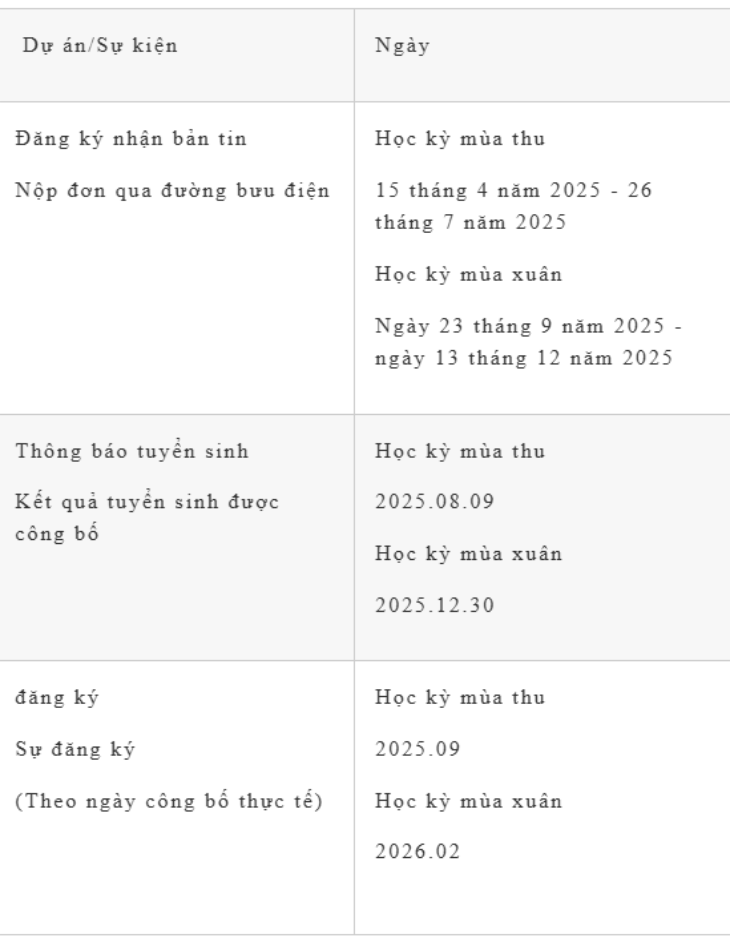 Thời gian nhập học của trường chia làm 2 đợt chính học kì thu Tháng 9 (hệ đại học, hệ thạc sĩ, hệ tiến sĩ), và học kì mùa xuân Tháng 2( chủ yếu hệ thạc sĩ và tiến sĩ)