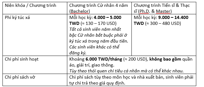 Trong 3 năm đầu: học phí và phí phụ giống như chương trình Thạc sĩ, tức khoảng NT$50,760/ kỳ