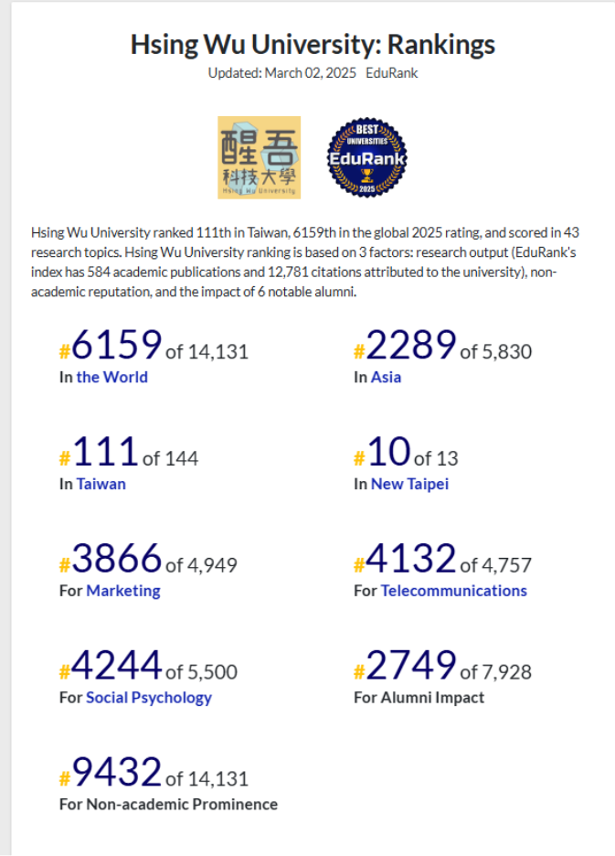 Theo EduRank (năm 2025), Hsing Wu University đứng thứ 111 trong số các trường đại học tại Đài Loan và hạng 6.159 toàn cầu, dựa trên các chỉ số như số lượng công bố nghiên cứu, trích dẫn (citations), uy tín bên ngoài học thuật và ảnh hưởng của các cựu sinh viên.