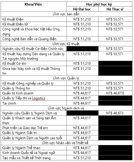 - 8.000~12.000 Đài tệ/học kỳ trong 8 học kỳ