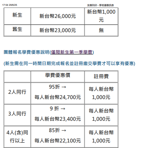 Học viên cũ: 23,000 NTD (miễn phí đăng ký)